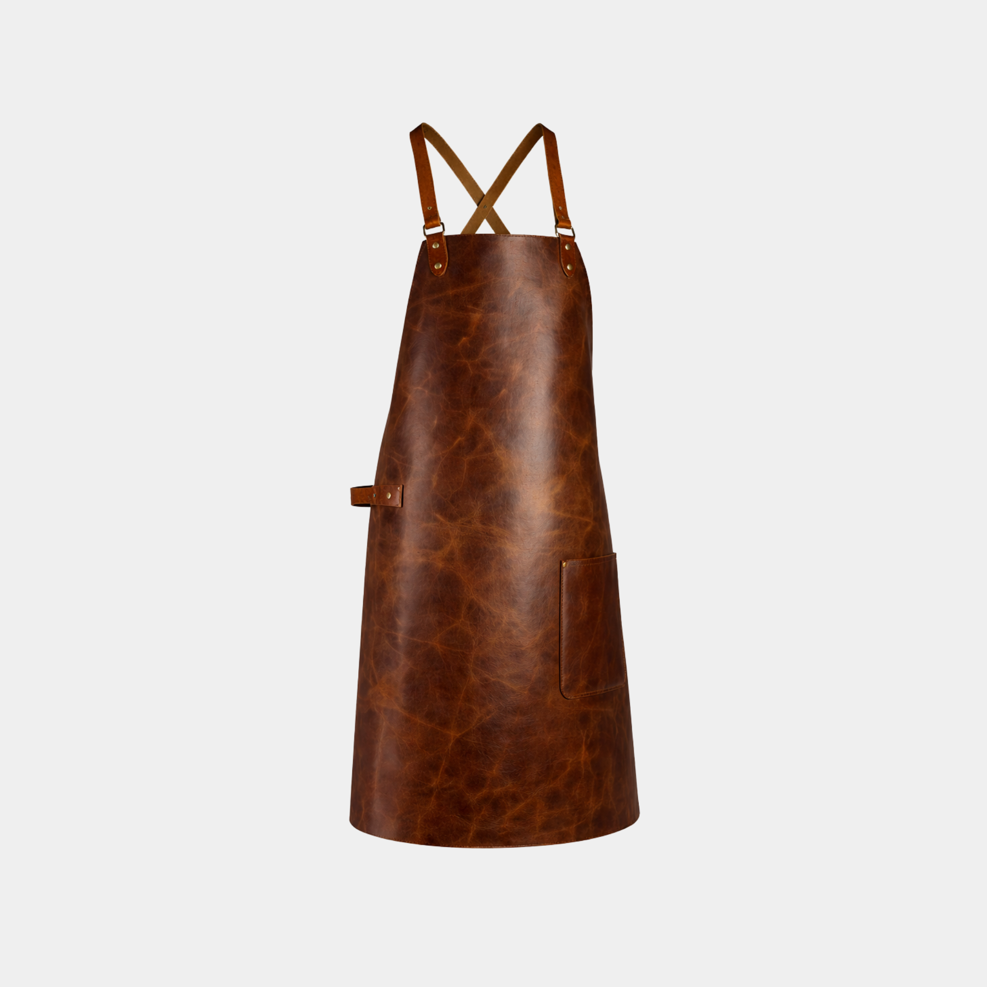 Dark brown full-grain leather apron with 5-point adjustable fit, towel loop, and pocket. Lightweight, durable & customizable for daily professional use.