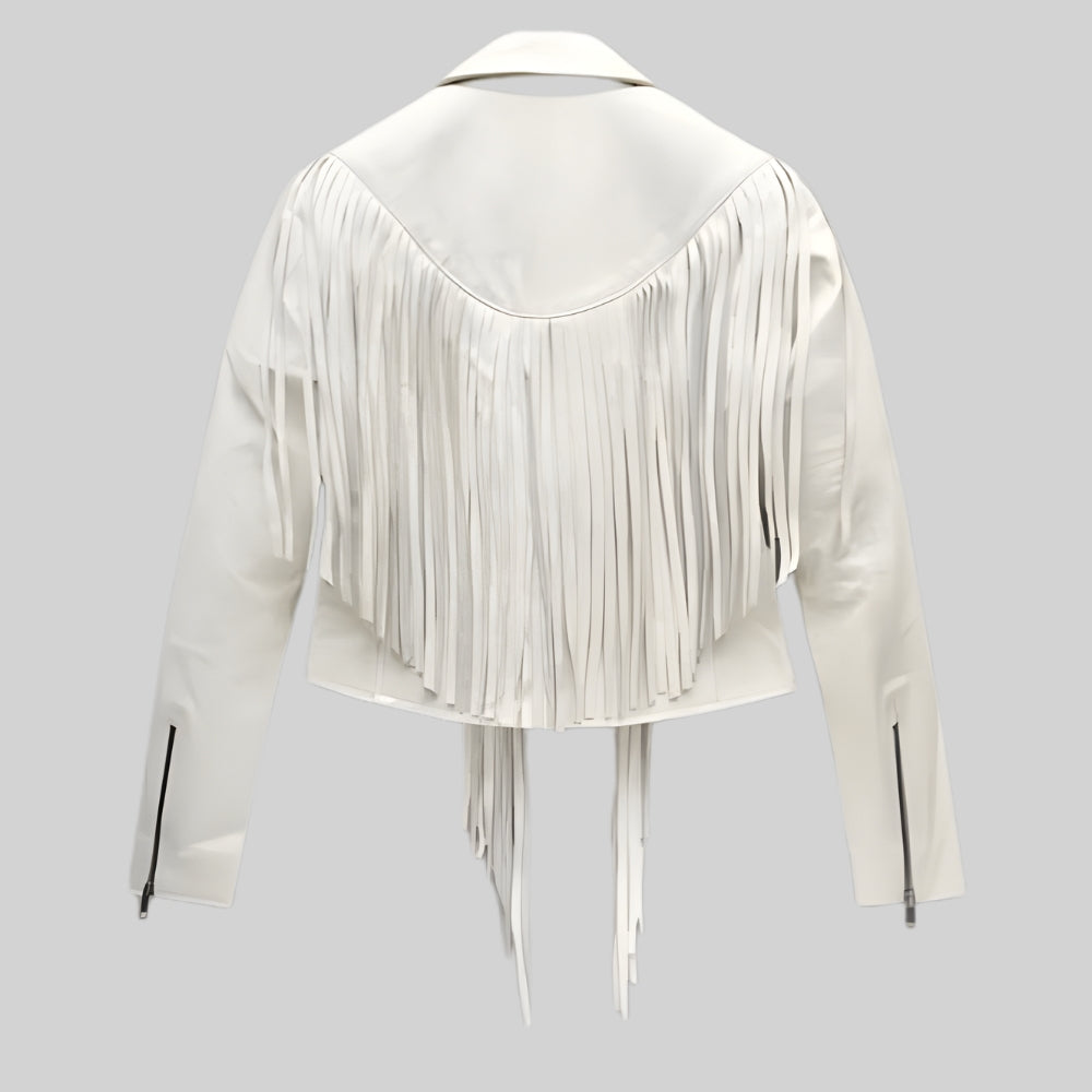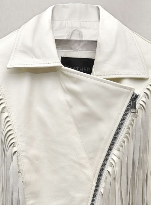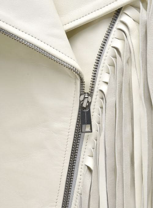 Color & Design: Off-white leather with silver zippers and fringe detailing for an edgy, standout look.