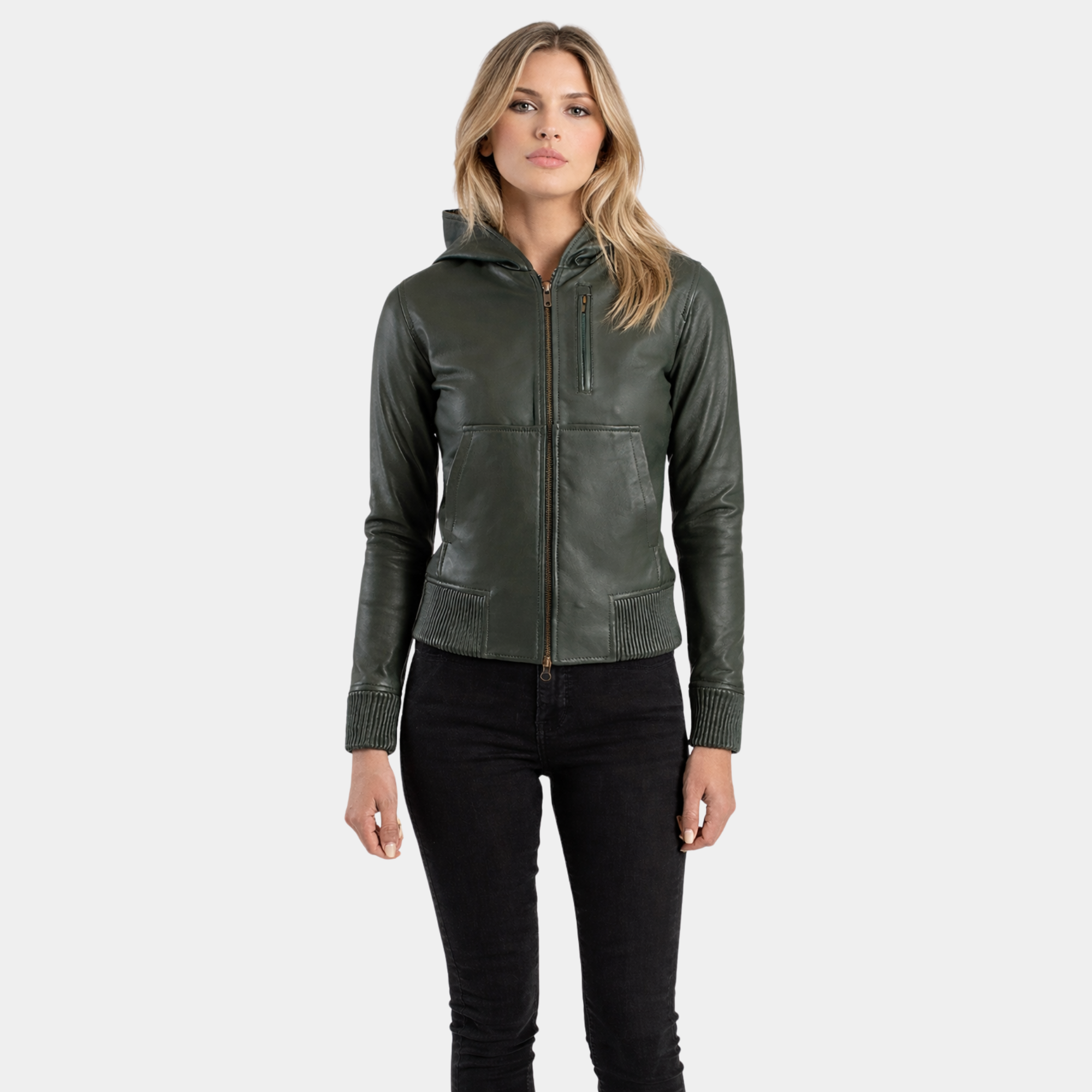 Luna Green Hooded Leather Bomber Jacket