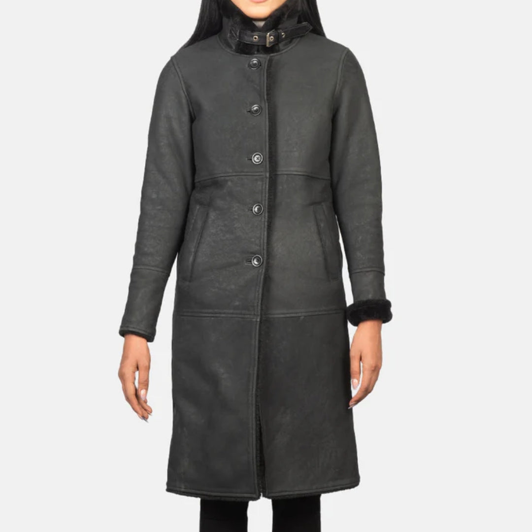 The Alina Shearling Black Leather Coat offers the perfect balance of luxury and functionality. Crafted from genuine black leather and fully lined with soft shearling, this coat is designed to keep you warm without compromising on style.
