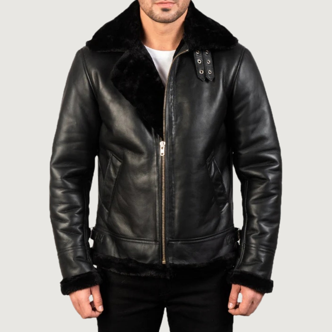 Inspired by classic aviator style, this black sheepskin leather jacket delivers unmatched warmth and rugged appeal. Crafted from real leather with a semi-aniline finish and fully lined with faux fur, it features a buckled collar, roll-back cuffs, and waist adjustment straps for a custom, comfortable fit.