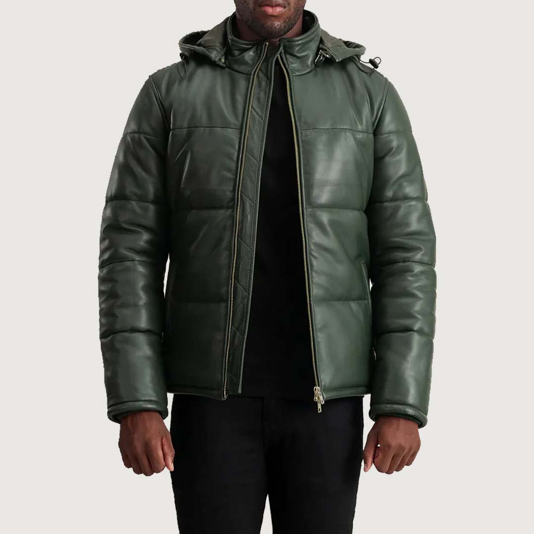 The Gordon Green Hooded Leather Puffer Jacket offers a perfect balance of style and functionality. Made with premium sheepskin leather and a semi-aniline finish, it features a high-neck collar for extra warmth, along with a removable hood for versatile wear. The jacket’s hidden ribbed cuffs and practical pockets complete its sleek, functional design.