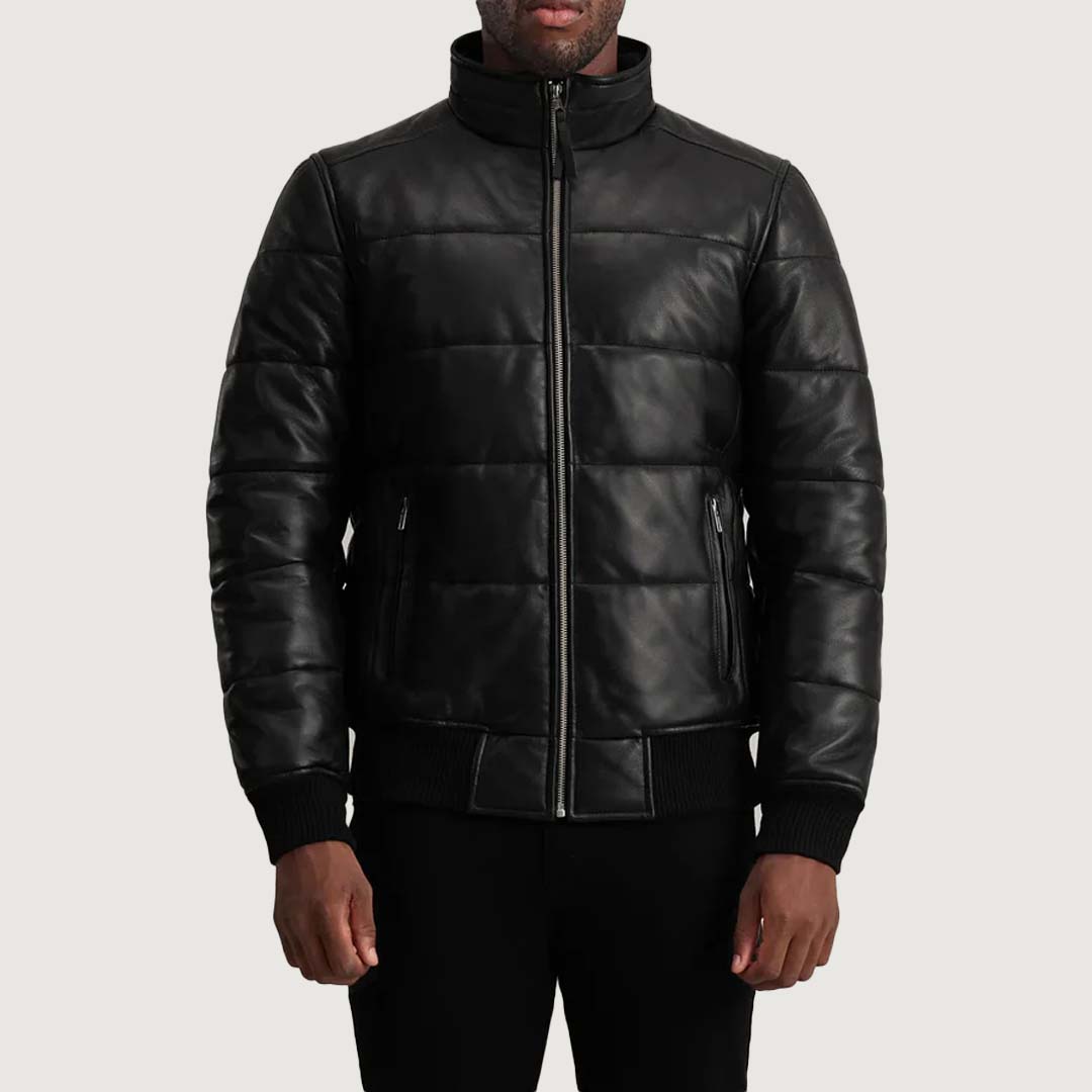 The Lucas Black Leather Puffer Bomber Jacket combines rugged leather style with ultimate comfort. Made from premium sheepskin leather with a semi-aniline finish, it features a high-neck collar and rib-knit cuffs for extra warmth. Perfect for colder days, this jacket offers both a sleek look and practical features.