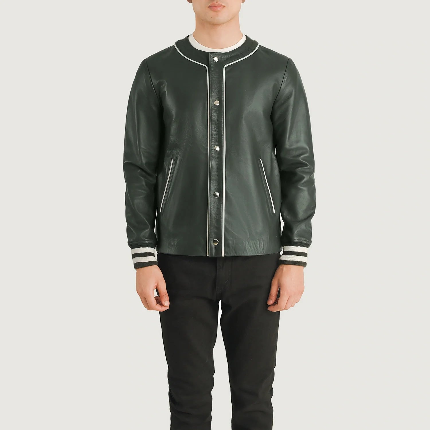 A modern revival of the classic baseball varsity jacket, this piece redefines sportswear with a premium touch. Crafted from semi-aniline full-grain sheepskin leather, it offers a perfect blend of sporty aesthetics and lasting durability. The collarless design, stripe detailing, and snap-button closure pay homage to classic baseball jerseys while ensuring a sleek, contemporary look.